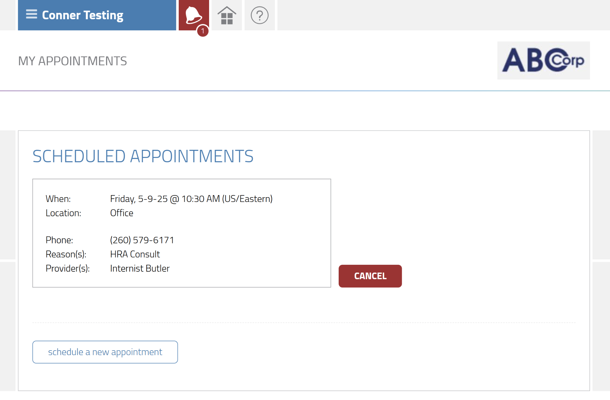 After completing the Health Risk Assessment - Biometric Screening Questionnaire, the HRA Consult Appointment can be scheduled. Click the “schedule” button to schedule the HRA Consult Appointment.