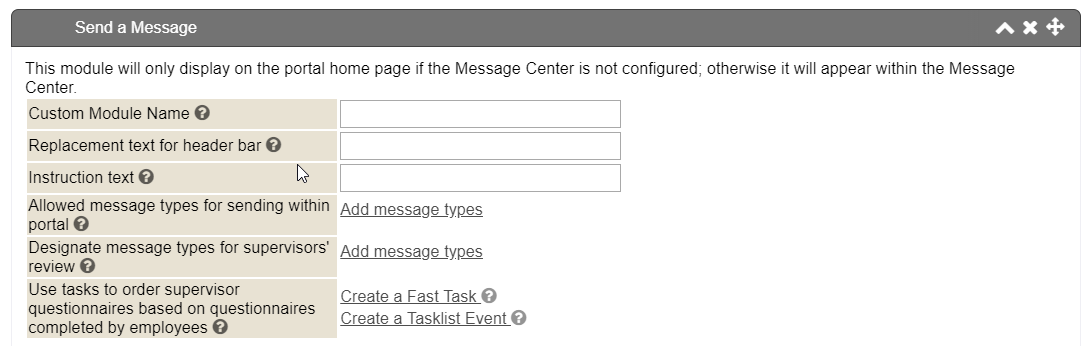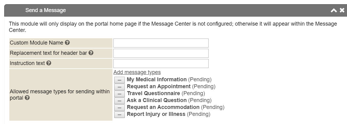The Send a Message module can have its name and header customized, the sending instructions modified, or the message types configured, to determine what can/cannot be sent to and from the portal: