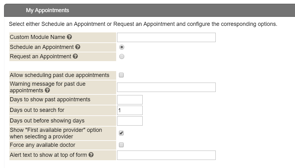 • Custom Module Name: The name defaults to My Appointments. Customize up to 60 characters.