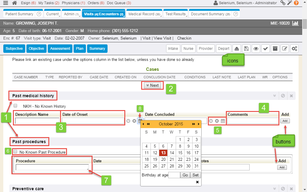 - Staging tabs: Changes the stage of an open encounter and indicates that one user is finished with the encounter. The next user takes over in the new stage.